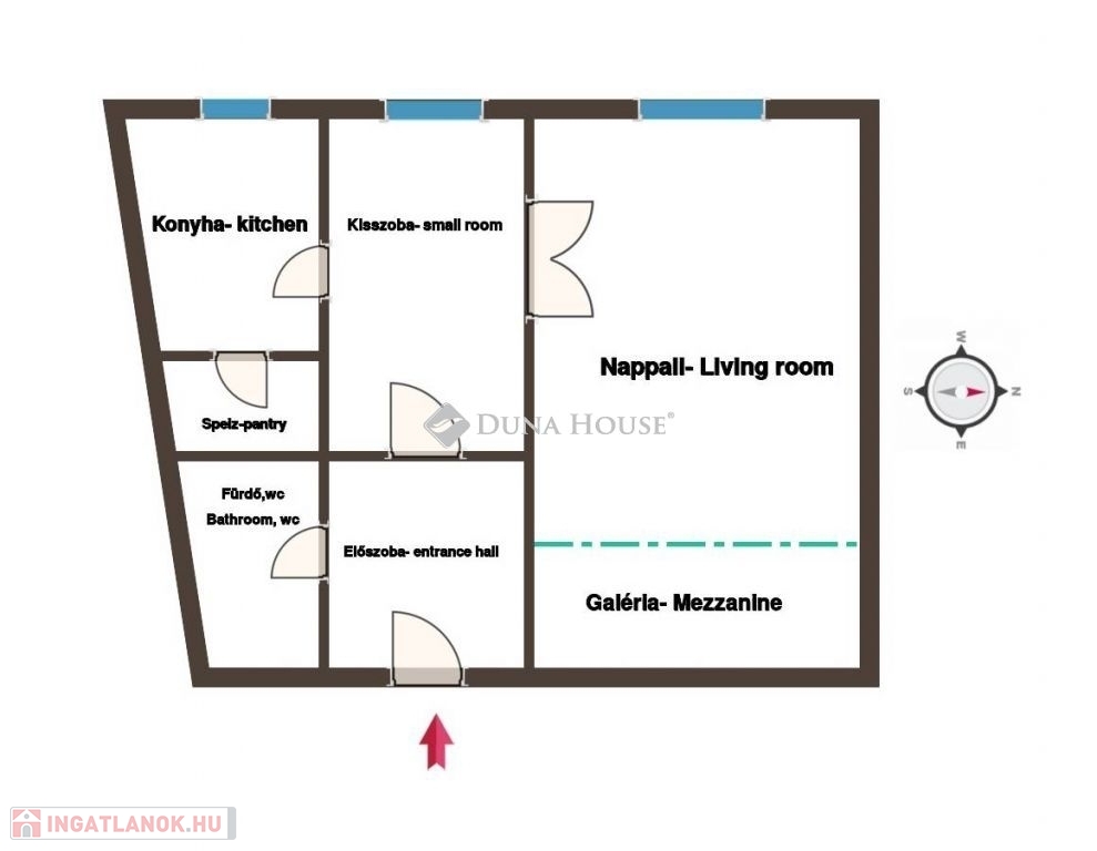 Elrendezés: 1+fél szoba + galéria, ami tágasabbá teszi a teret.