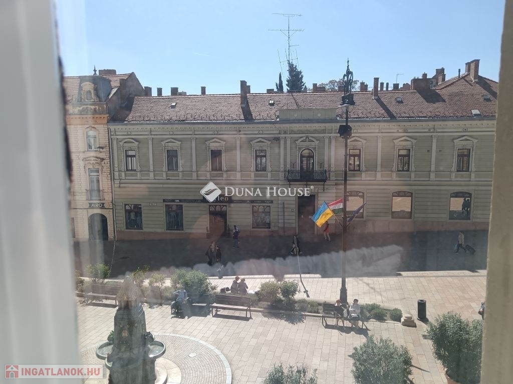 Kilátás: Az ablakok közvetlenül a Zsolnay kútra néznek.