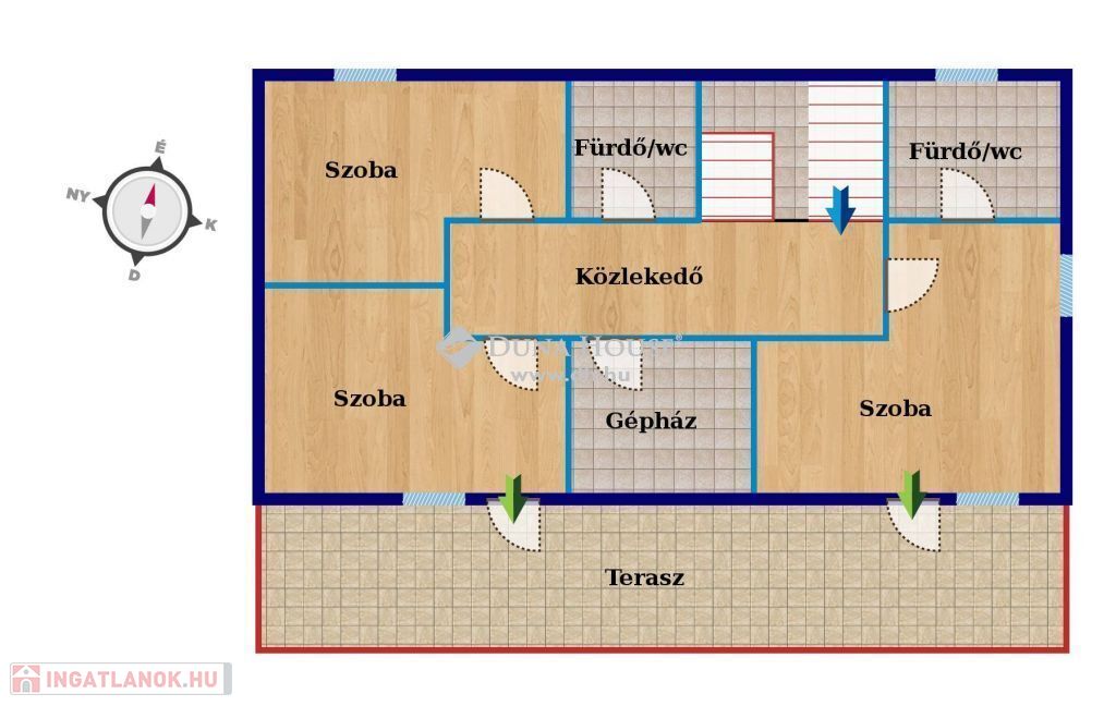 A kétszintes lakótérben (108 m2) amerikai konyhás nappali, 3 hálószoba kapott helyet. Különlegessége, hogy a ház földszintjén egy, míg az emeleten két külön fürdőszoba található, a szülők és a gyerekek kényelméért!