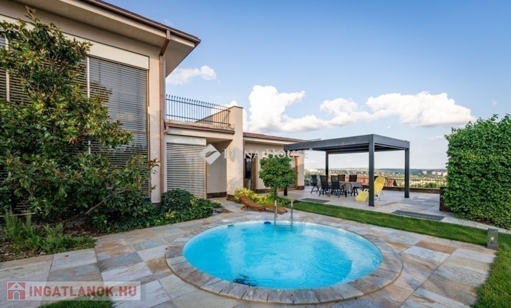 A házhoz tartozik egy kétállásos garázs, több tárolóhelyiség, valamint egy több mint 100 m²-es, természetes kőburkolatú terasz pergolával. A parkosított kertben halas tó és medence is helyet kapott, a gondosan megtervezett környezet pedig nyugalmat és harmóniát áraszt.