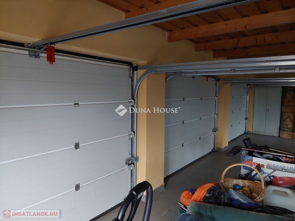 Utcafronton 3 állásos, elektromos Hörmann kapukkal felszerelt garázs épült, pakolható tágas tetőtérrel. A garázs alatt hűtőkamra, fatároló és műhely került kialakításra.