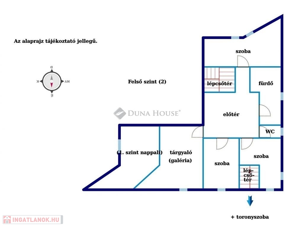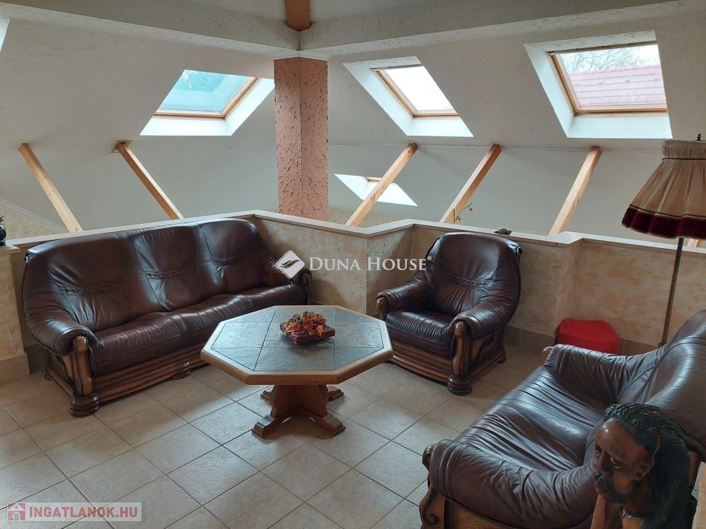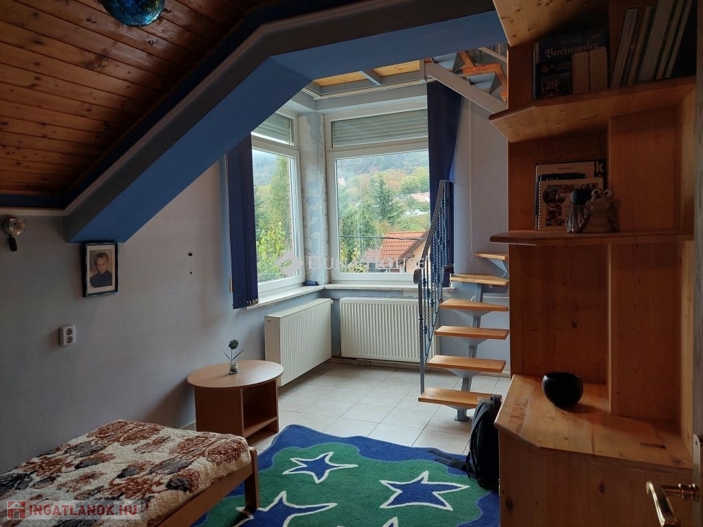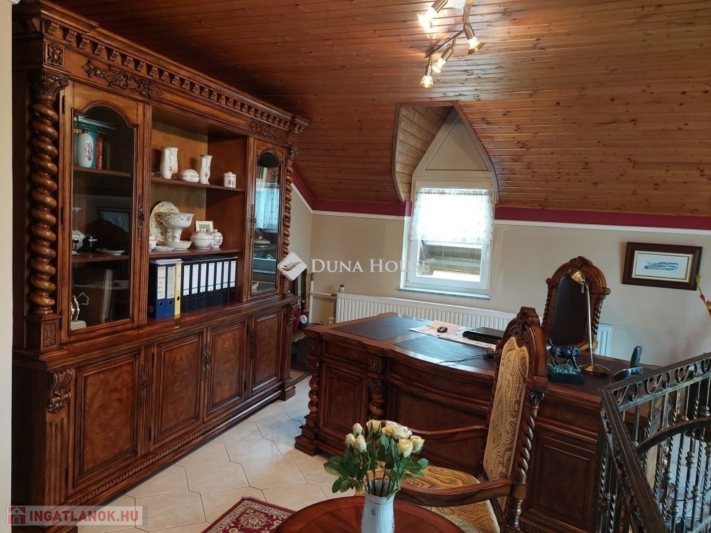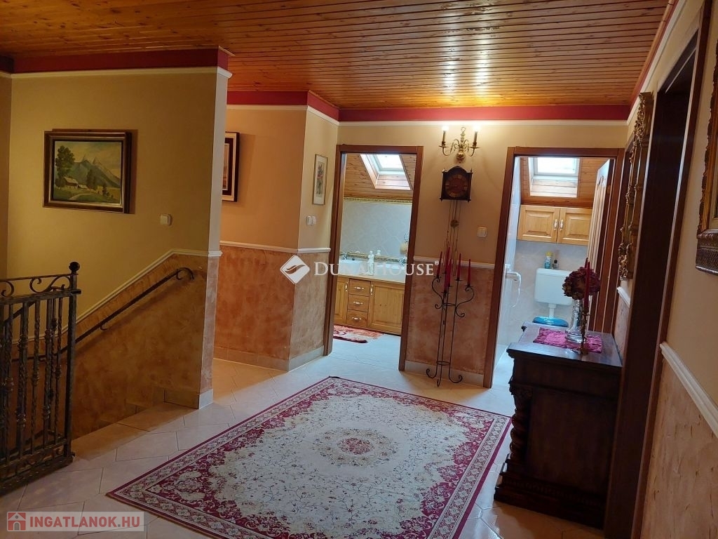 A felső szinten kialakításra került 3 hálószoba, egy a galérián berendezett dolgozó szoba, fürdő, WC. Az egyik hálóból csigalépcsőn jutunk fel egy további toronyszobába.