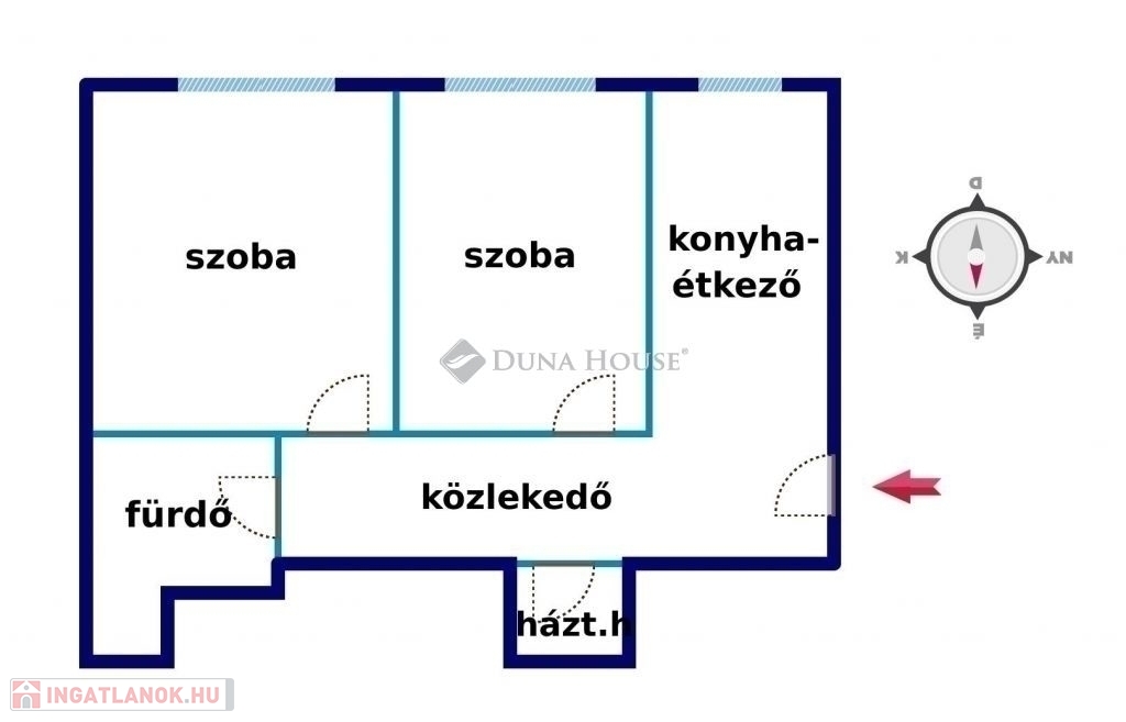Az ingatlan belső elrendezése:2 külön bejáratú szoba, tágas konyha-étkező, fürdőszoba wc-vel, közlekedő és háztartási helység.